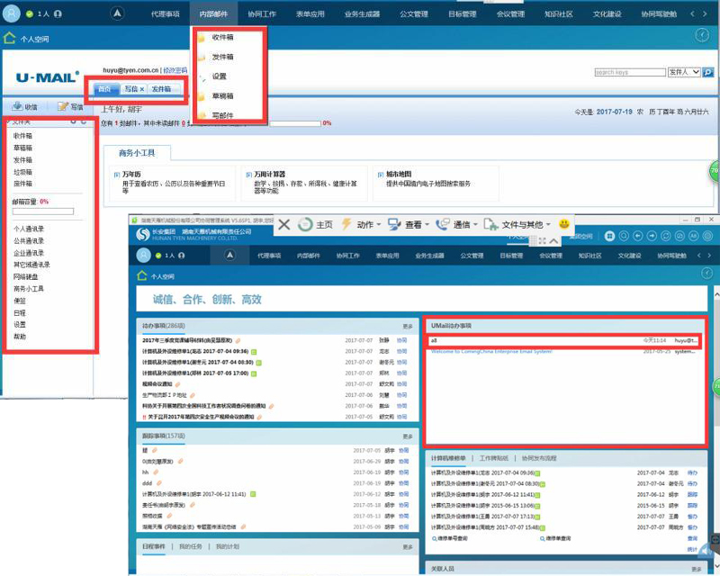 近期公司計劃上線套內網辦公OA(致遠)系統。將原來使用免費的企業郵箱,替換為本地自建企業郵箱,從數據的安全性,收發權限與成本投入等因素考慮。公司領導一致同意,將OA系統與郵件系統一起本地化部署方案。通過對國內的專業廠家的產品功能,價格,售后做了全方面的對比,終采用了U-Mail郵件系統軟件。將U-Mail郵件系統做嵌入到OA界面的