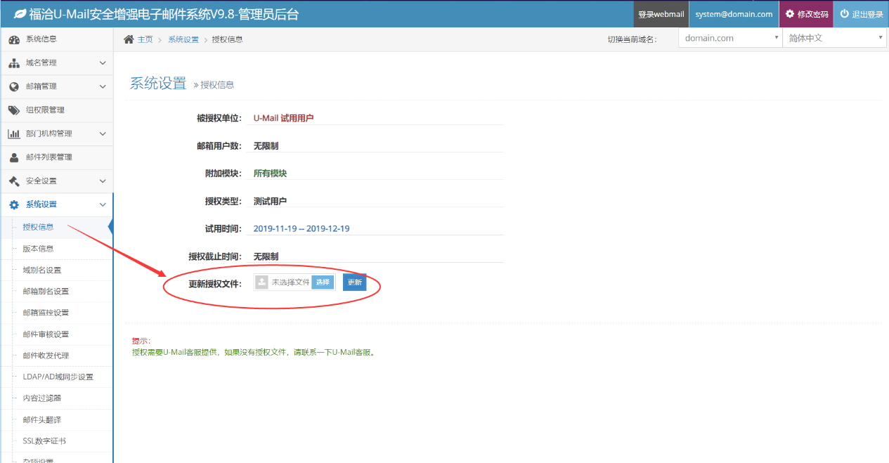 24、更新授權文件,點擊【系統設置】,【授權信息】,更新授權文件進行導入授權