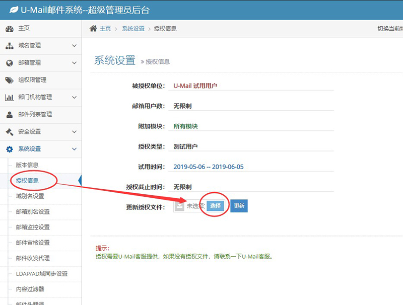 18、更新授權文件,點擊【系統設置】,【授權信息】,更新授權文件進行導入授權