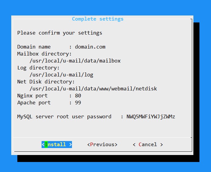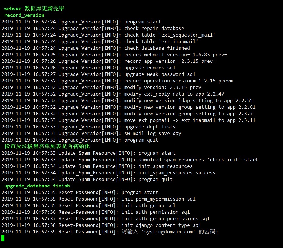 12、中間安裝過程忽略,直到提示【請輸入 'system@domain.com' 的密碼:】,在這里自行設置下管理員的密碼,輸完回車確定,若后面忘記,可以在安裝完成后執行:/usr/local/u-mail/app/sbin/admin_setting init來重置管理員密碼。