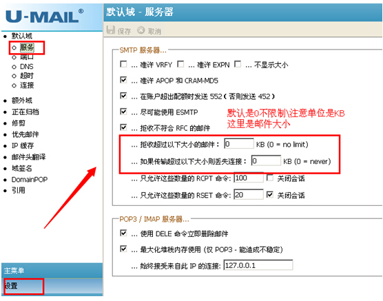 U-Mail郵件系統郵件附件大小默認設置為0,表示不限制附件的大小。如果要限制附件的大小,步驟如下: